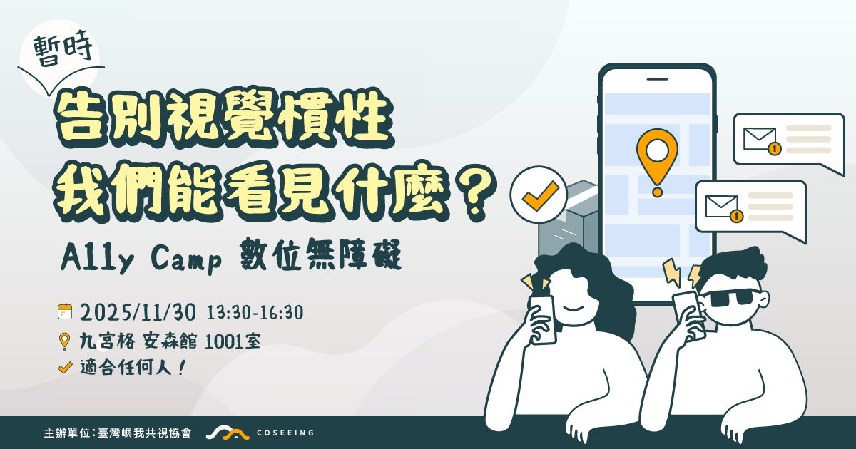 我們想邀請你來參加 A11y Camp,暫時告別視覺慣性,體驗主要感知被「暫時阻斷」時,該如何依靠「聽覺指令」,重新建立方向與信任感?這場活動將翻轉原本對「資訊傳達」的想像,你會重新認識那些早已習慣的一切。